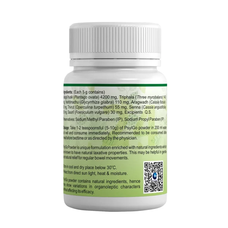 PsylGo Powder, an Ayurvedic proprietary laxative, is your natural solution for digestive well-being. Carefully formulated, it combines traditional Ayurvedic wisdom with modern convenience. This effective laxative aids in gentle and natural relief, promoting regular bowel movements without harsh side effects. PsylGo Powder is your trusted choice for maintaining digestive harmony, ensuring a balanced and comfortable lifestyle. Embrace the natural path to digestive wellness with the power of PsylGo Powder.